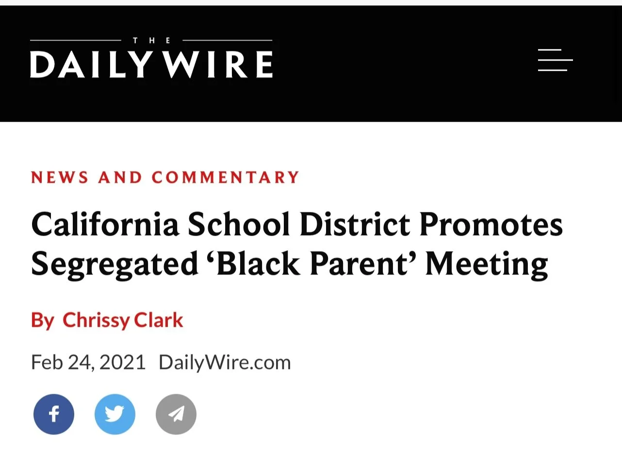 Clark, C. (2021). California School District Promotes Segregated “Black Parent” Meeting. Retrieved on February 1, 2022