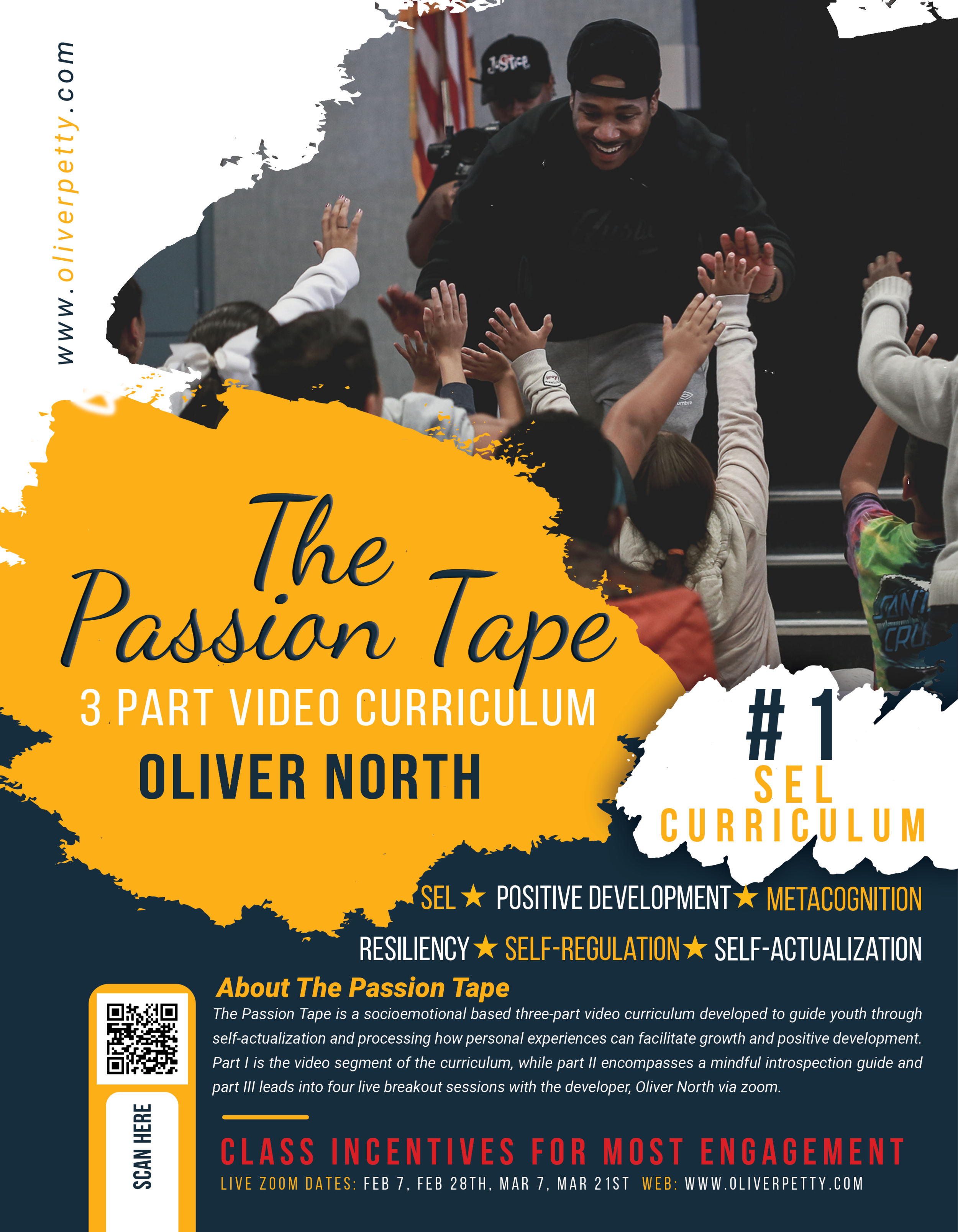 The Passion Tape is a socioemotional based three-part video curriculum developed to guide youth through self-actualization and processing how personal experiences can facilitate growth and positive development. Part I is the video segment of the curriculum, while part II encompasses a mindful introspection guide and part III leads into four live breakout sessions with the developer, Oliver North via zoom.